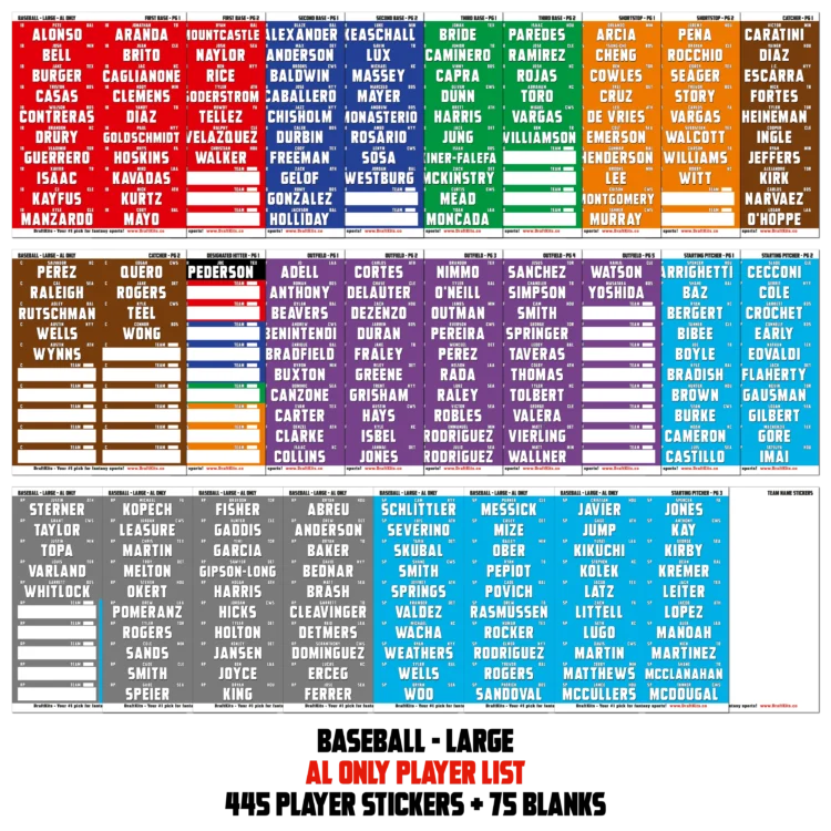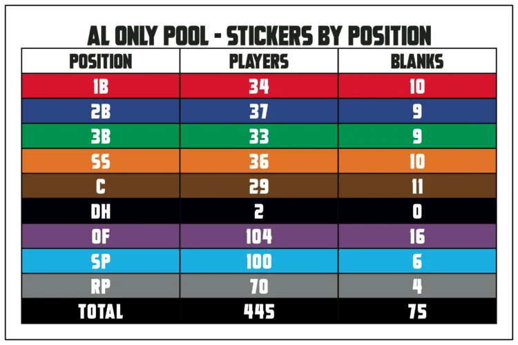 • AL ONLY PLAYER POOL – 445 Player Stickers PLUS Color-coded Blanks