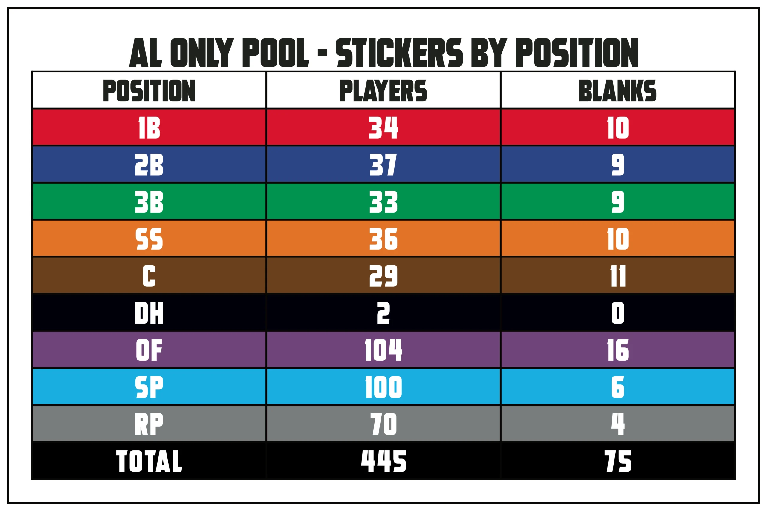 • AL ONLY PLAYER POOL – 445 Player Stickers PLUS Color-coded Blanks