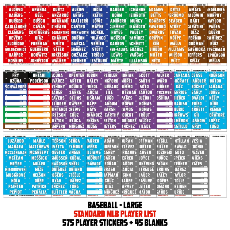 • COLOR CODED player stickers sorted alphabetically by position (1B, 2B, 3B, SS, C, DH, OF, SP, RP)