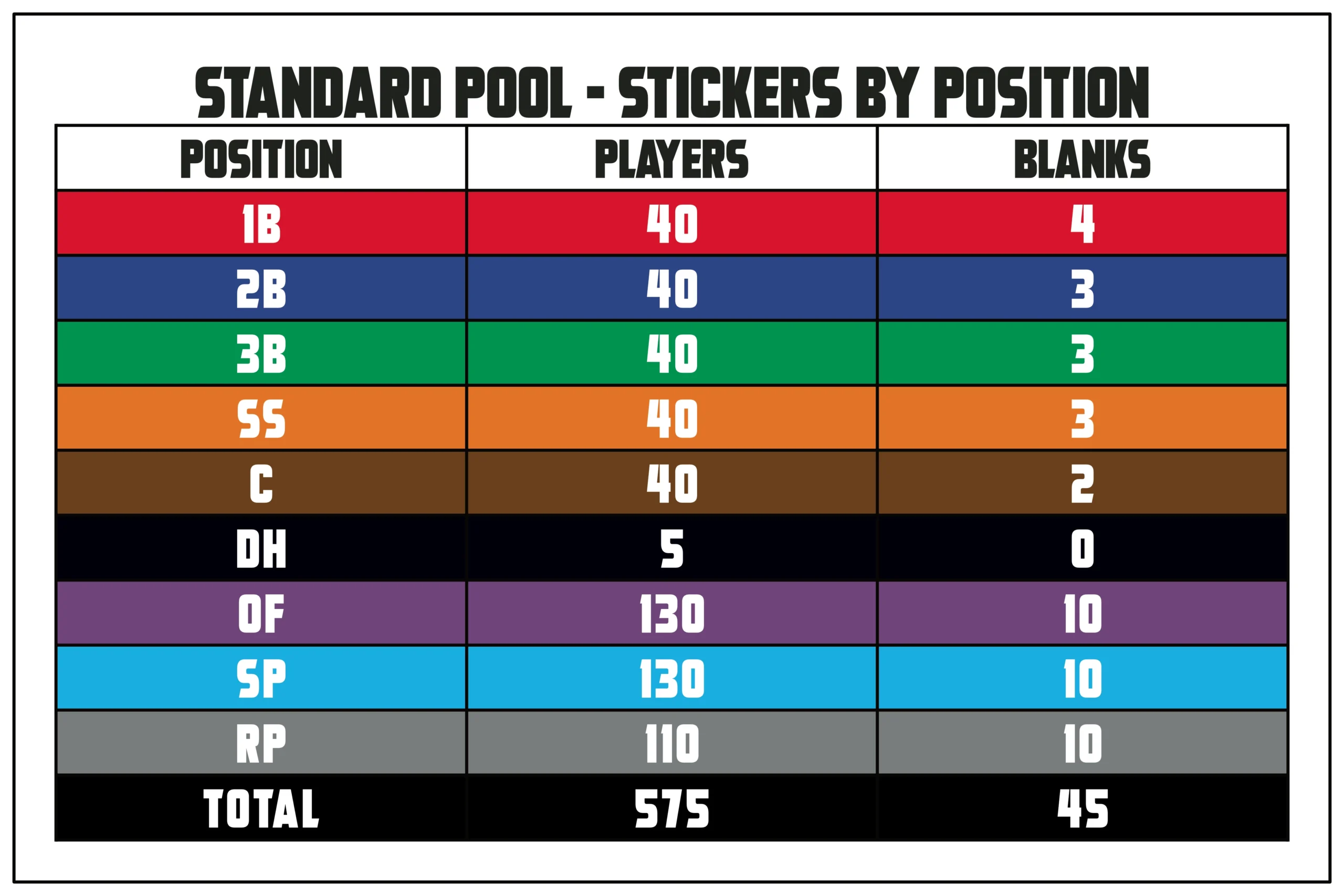 • STANDARD PLAYER POOL – 575 Player Stickers PLUS Color-coded Blanks