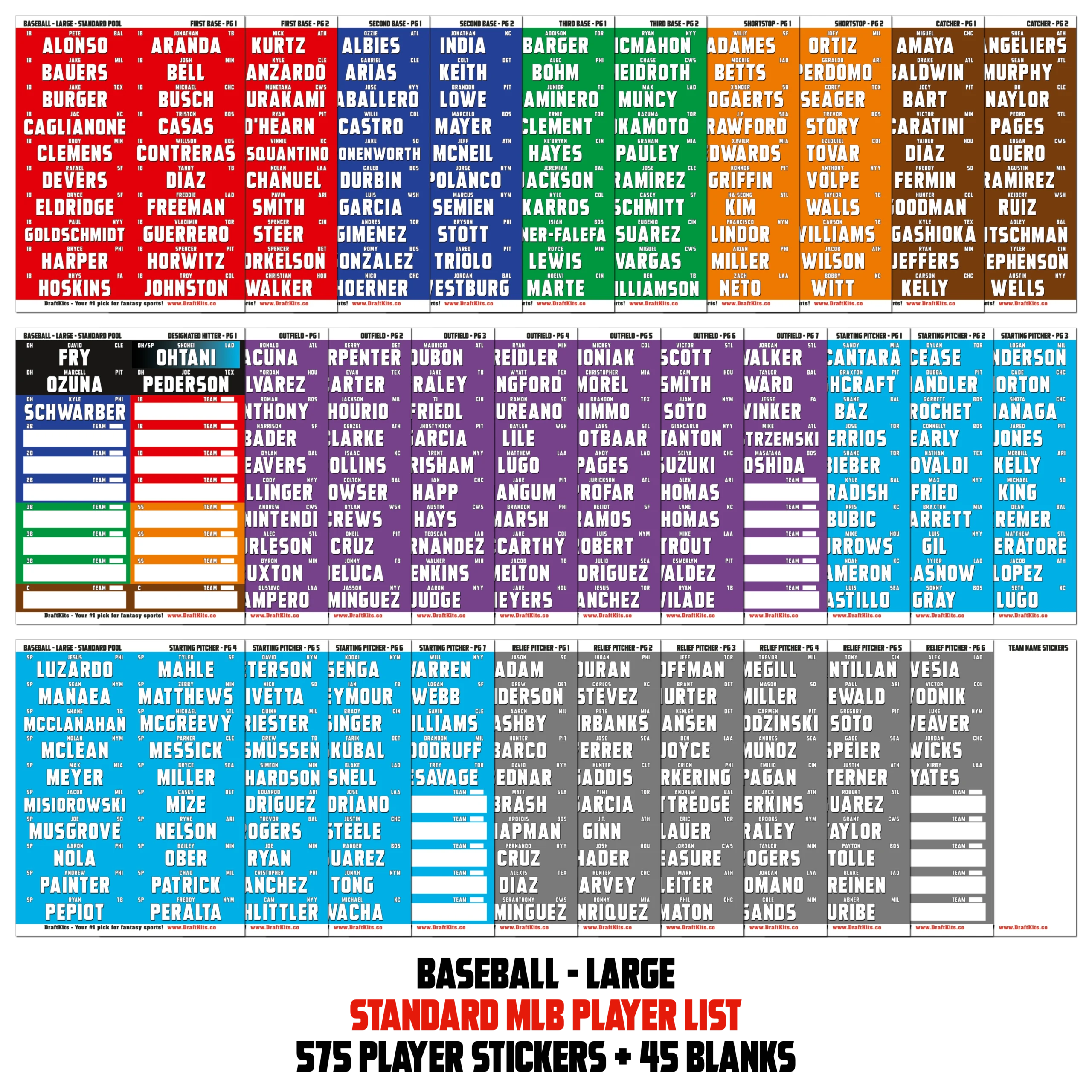 • COLOR CODED player stickers sorted alphabetically by position (1B, 2B, 3B, SS, C, DH, OF, SP, RP)